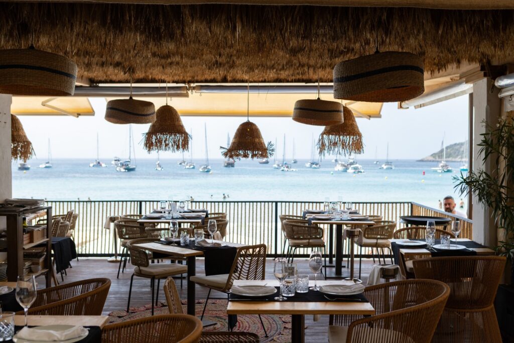 Overlooking the pool and offering views of Ibiza Town and the Mediterranean, the restaurant is equally suited for sunset dinners or late-night dining.