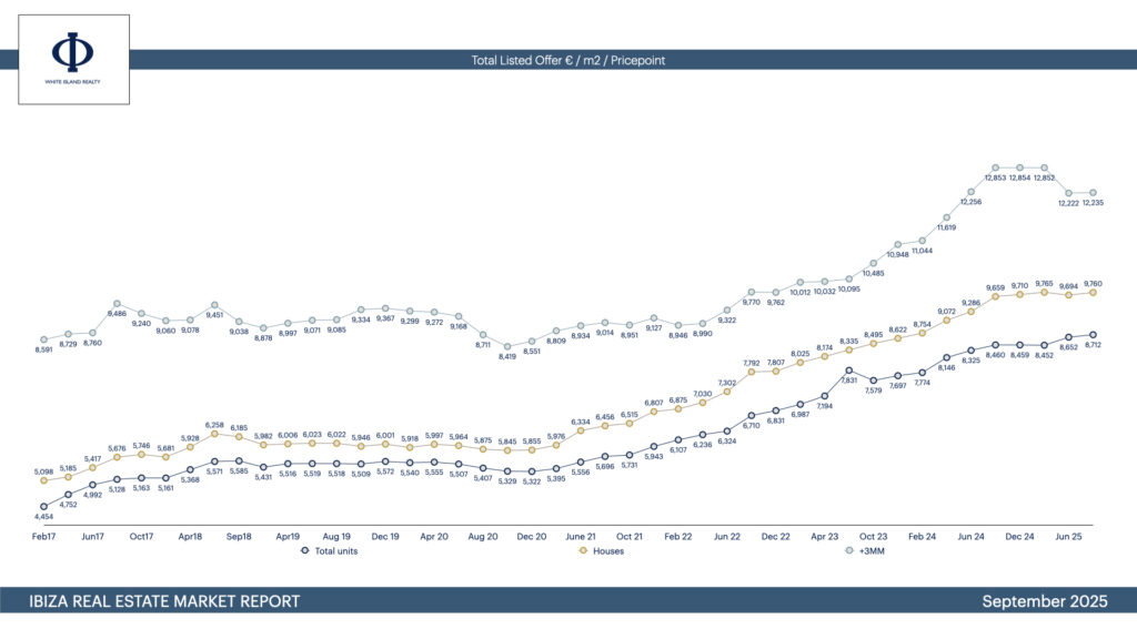 The island is currently experiencing a steady appreciation in value, with the average listed price climbing to €8,712/m², a 3% increase over the last year and a 12% jump since 2023. Interestingly, the ultra-luxury sector—properties priced above €3 million—saw a modest price correction of 5%, bringing the average price in this segment to €12,235/m².
